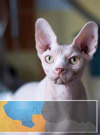 斯芬克斯猫(Sphynx)又称加拿大无毛猫。这种猫是由于基因突变而产生的品种。体重3.5到7公斤,肌肉发达,毛发稀疏,皮肤皱褶似羚羊皮。头部棱角分明。微呈三角型。眼大呈柠檬状,多数呈金色,上眼角斜向耳,间距较宽。这是一种对阳光十分敏感的猫。 斯芬克司猫性格活泼,贪玩,独立性强,无攻击性,能与其它的狗、猫相处。感情丰富,希望得到主人的专宠。 因为无毛,对外界温度调节能力差,既怕冷、又怕热,与众猫不同的是该品种猫能出汗、对阳光敏感(应避免长时间阳光直射),这种猫适合公寓饲养。母猫每年发情不超过两次,幼猫出生死亡率高,新生小猫皮肤皱多,脊被上的毛随着年龄的增长而消失。主人应经常护理猫的耳朵,以防耳内发炎或耳螨滋生。